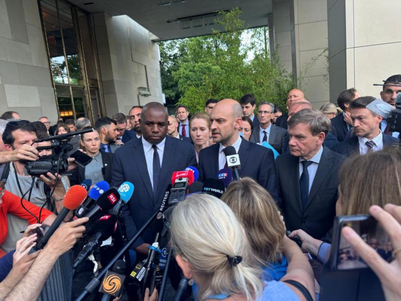 6月20日,在瑞士日内瓦,德国外长瓦德富尔(中右)、英国外交大臣拉米(中左)、法国外长巴罗(中)与媒体见面(手机照片)。伊朗与英法德三国外交部长当地时间20日19时左右结束在瑞士日内瓦持续约3个小时的会晤。这是以色列与伊朗发生军事冲突以来,伊朗首次与西方国家高级官员进行面对面磋商。新华社记者王其冰摄