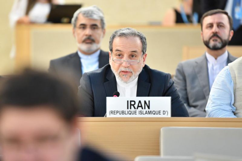6月20日,在瑞士日内瓦万国宫,伊朗外交部长阿拉格齐(中)在联合国会议上发言。新华社记者连漪摄