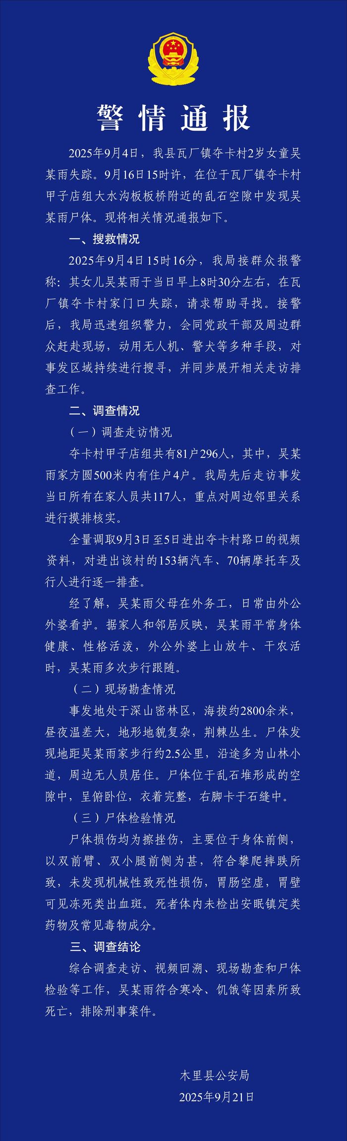 四川木里县2岁走失女童遇难,警方通报:排除刑事案件