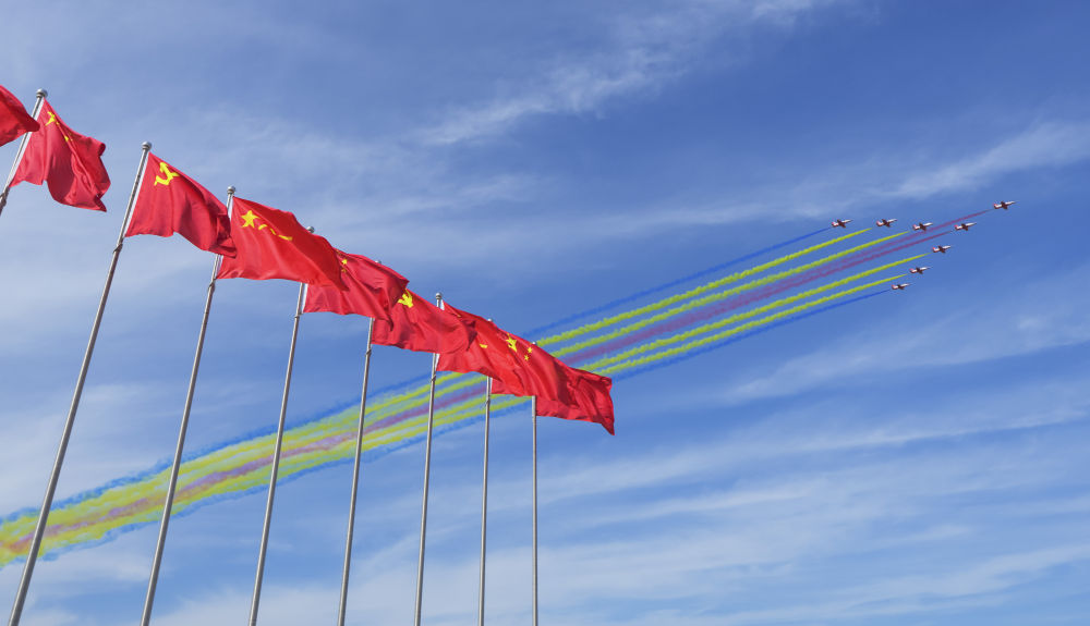 ↑9月19日,歼-20四机编队进行机动飞行展示。新华社记者 颜麟蕴 摄