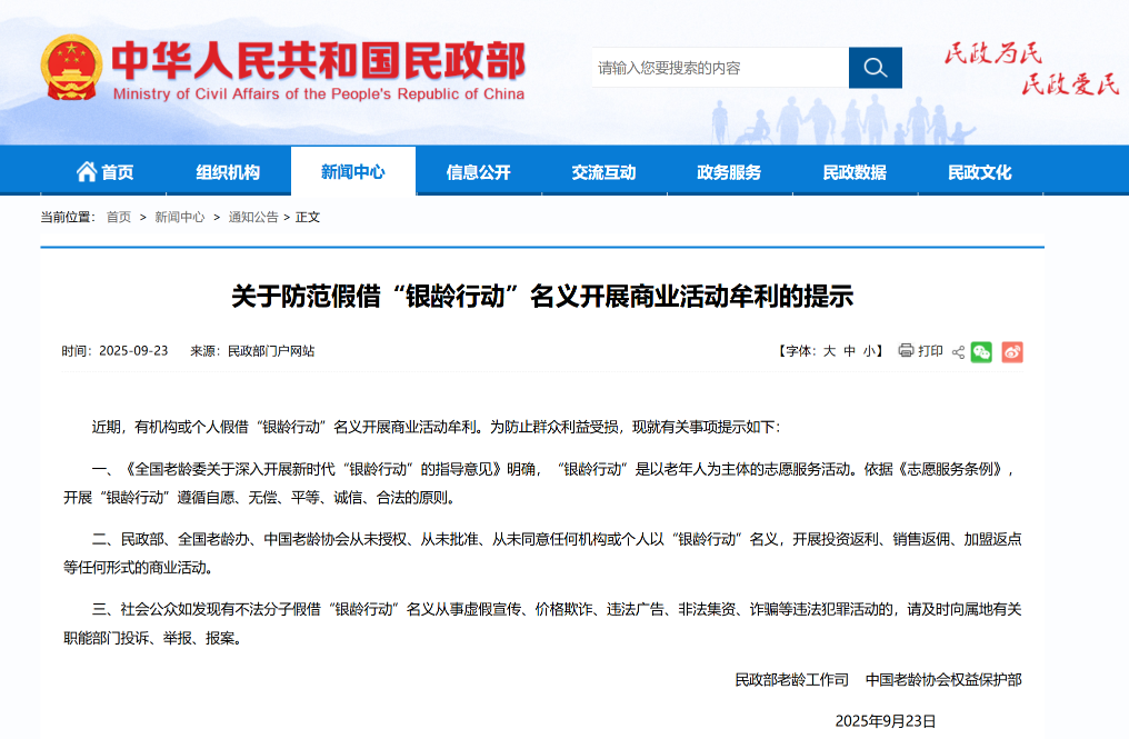 近期,有机构或个人假借“银龄行动”名义开展投资返利、销售返佣、加盟返点等商业活动牟利。为防止群众利益受损,9月23日,民政部发布公告提示,民政部、全国老龄办、中国老龄协会从未授权、批准、同意任何机构或个人以“银龄行动”为名义,开展任何形式的商业活动。