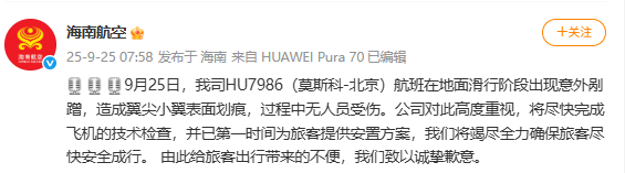 据海南航空微博消息,9月25日,海南航空发布声明:9月25日,公司HU7986(莫斯科-北京)航班在地面滑行阶段出现意外剐蹭,造成翼尖小翼表面划痕,过程中无人员受伤。公司对此高度重视,将尽快完成飞机的技术检查,并已第一时间为旅客提供安置方案,将竭尽全力确保旅客尽快安全成行。