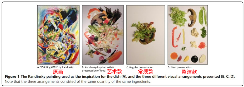 Charles Spence 团队将 17 种食材组成的沙拉用三种不同的形式摆放,最左边的图为一幅抽象画(图片来源:[1])
