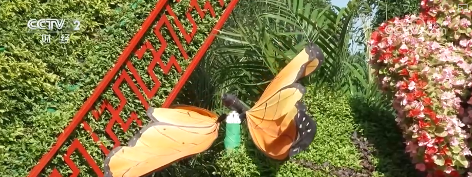 这里是景山公园的东门,这个花坛叫“嘉和东冉”,有许多市民游客在这里拍照打卡。这个花坛以中式窗框为背景,下面用四季海棠等不同花材组成的牡丹造型,中间还有动态的蝴蝶、牡丹科技装置作为点缀。