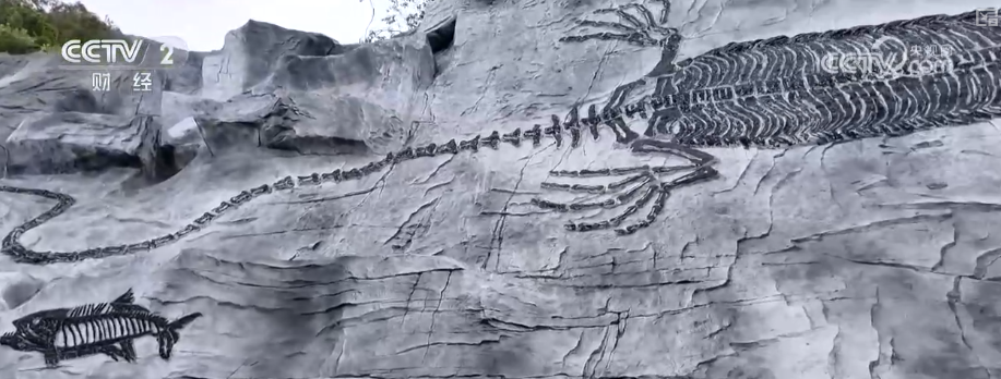 服务区的墙上很有创意地刻上了在这一带被发现的一些著名古生物化石形象。这是著名的“关岭龙”,它是鱼龙的一种,这是“贵州龙”。带上一家老小来“云渡”服务区看大桥。不但能吃到贵州各地的各种美食小吃,还能看恐龙涨知识,“云渡服务区”绝对是全国最有特点的“桥旅融合”服务区。