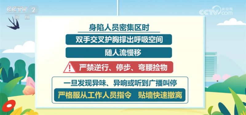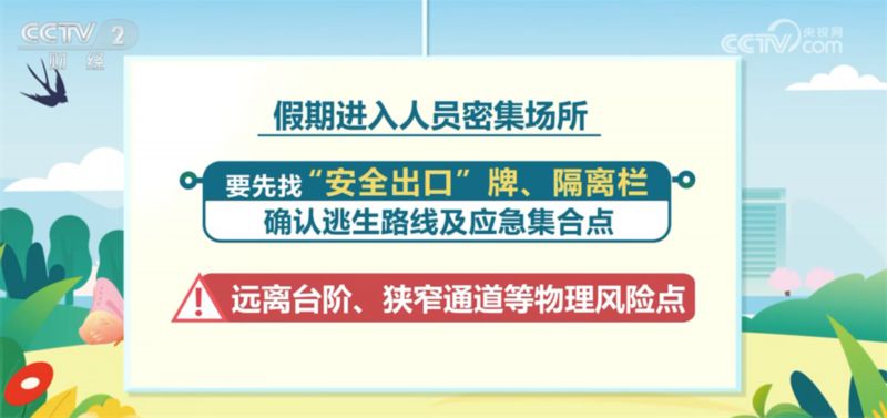 假期进入人员密集场所,要先找“安全出口”牌、隔离栏,确认逃生路线及应急集合点。远离台阶、狭窄通道等物理风险点。身陷人员密集区时,双手交叉护胸撑出呼吸空间,随人流慢移,严禁逆行、停步、弯腰捡物。一旦发现异味、异响或听到广播叫停,严格服从工作人员指令,贴墙快速撤离。