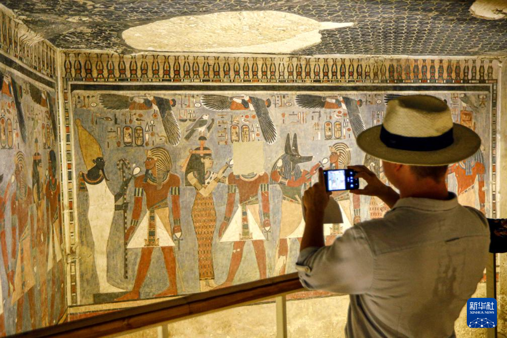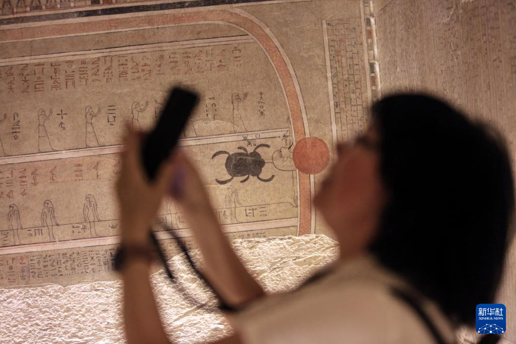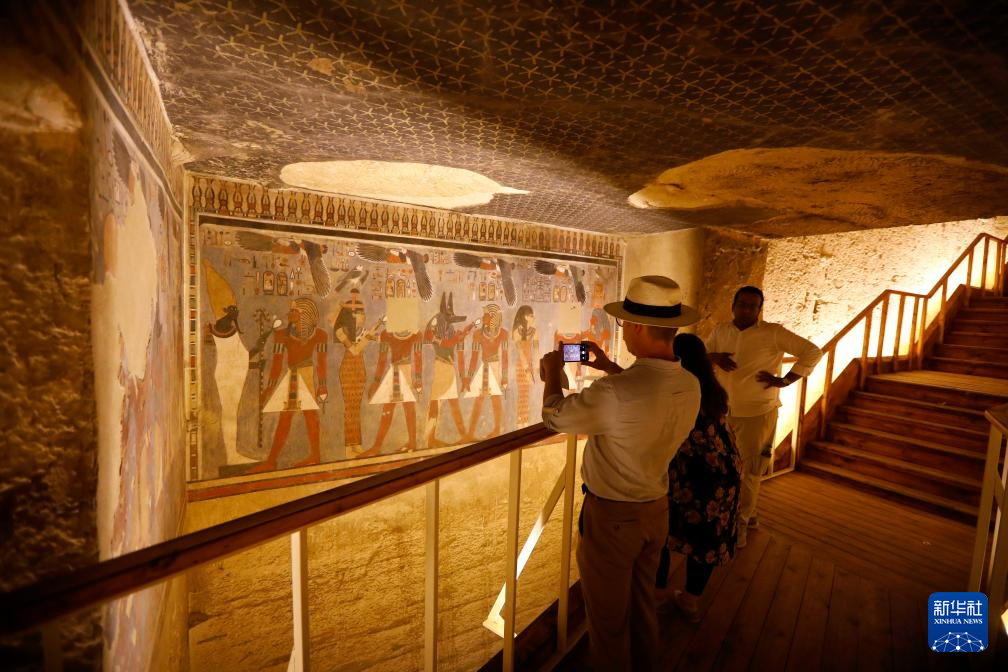 10月4日,游客在埃及卢克索帝王谷的阿蒙霍特普三世法老墓内拍照。