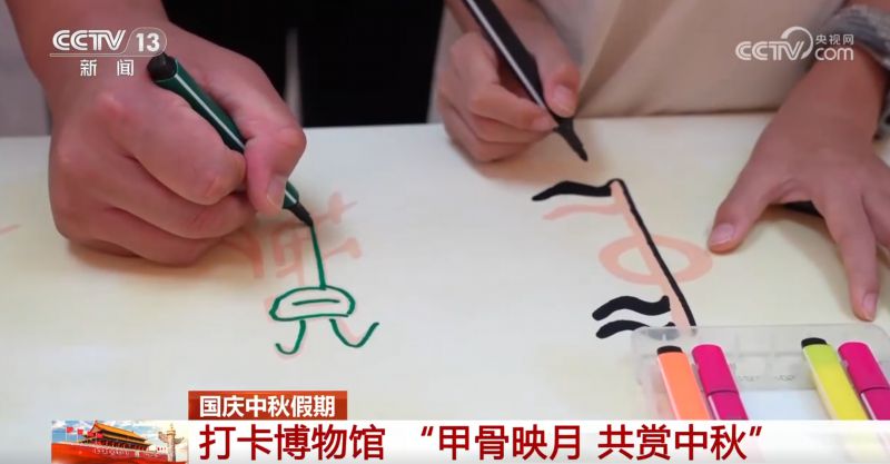在妙趣横生的手工环节,一家人通力合作,将承载着美好祝愿的甲骨文“月”“福”等字写在灯笼上,制作成独一无二的“甲骨文中秋灯笼”;孩子们在一幅5米长的中秋主题卷轴上,认真摹写甲骨文“中”“秋”“月”字。