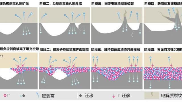 为了解决这一难题,研究团队开发出一种新技术:他们在硫化物电解质中引入了碘离子。在电池工作时,这些碘离子会在电场作用下移动至电极界面,形成一层富碘界面。这层界面能够主动吸引锂离子,像“自我修复”一样自动填充进所有的缝隙和孔洞,从而让电极和电解质始终保持紧密贴合。