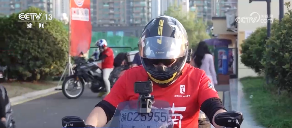在浙江富阳体育中心,一支6人摩托车队伍正合影留念,假日期间,他们相约从温州骑行300多公里来到杭州,观看自己的家乡篮球队与富阳篮球队即将展开的篮球对战。