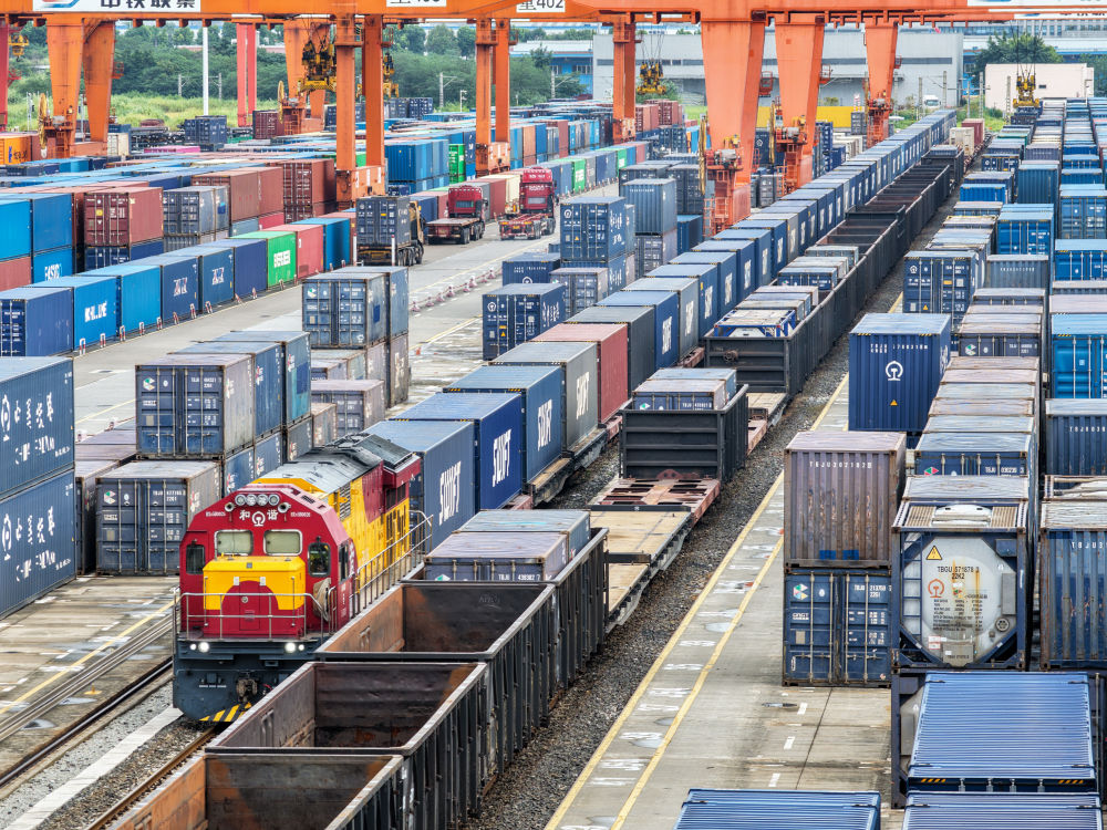 2025年9月8日,满载“重庆造”汽车的中欧班列(成渝)在重庆团结村中心站等待发车(无人机照片)。新华社记者 唐奕摄