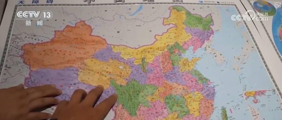 中国盲文出版社盲文编译部编辑殷梦岚表示,让她感受到祖国的幅员辽阔,从小就听人说祖国的地图像一只雄鸡在东方报晓,她这次深深体会到了雄鸡的样子是什么样的。首先可以摸到比较粗的线条代表的是国界,沿着国界线就能感受到祖国的轮廓,感受到祖国的范围非常广阔,还有不是很连续的线条代表的是海岸线,在图上也可以摸到祖国的海岸线也是非常长的。