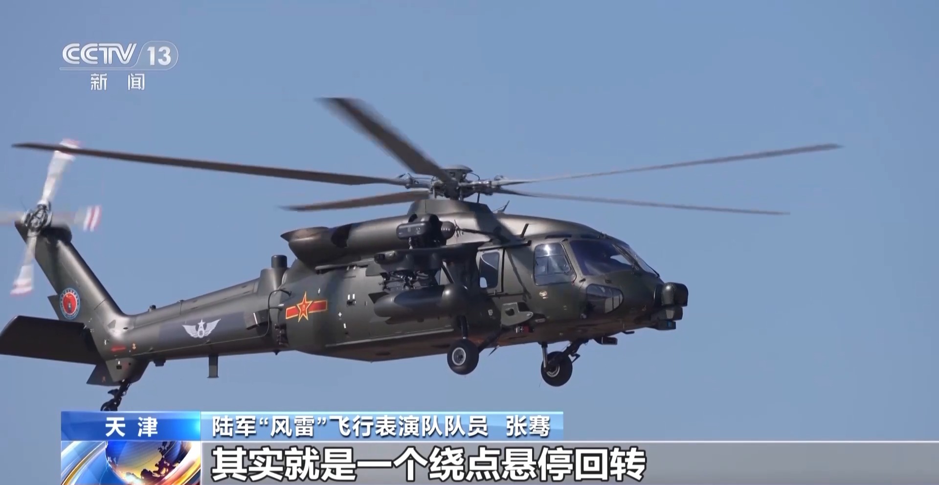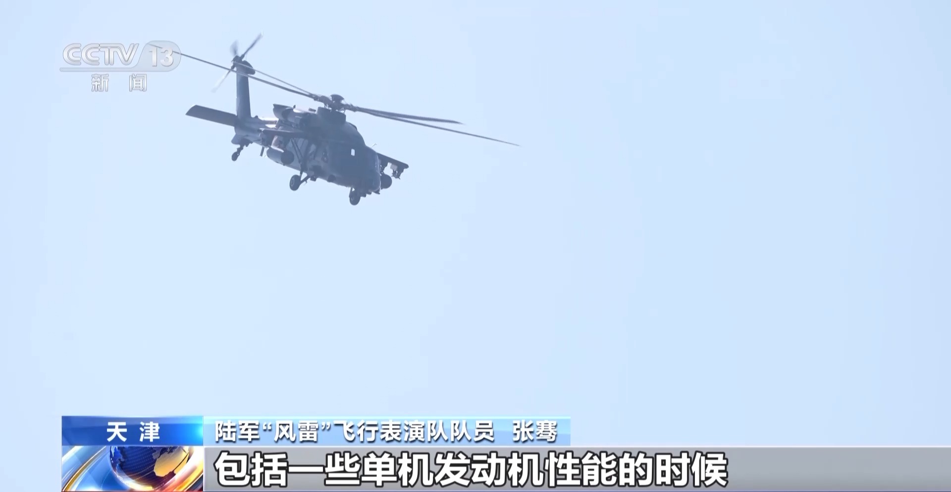 陆军“风雷”飞行表演队队员张骞:我们在展示它的突击能力的时候,包括单机发动机的性能的时候,动作体现出它发动机的跟随性特别好。它的自由涡轮的瞬间发热能力、转化成热功率的能力,包括它的复合材料的旋翼结构发出来的声音,包括它做一些动作的速度、频率、快慢,专业人员能看到这款机型的跟随性、飞控反应品质做得都非常好。