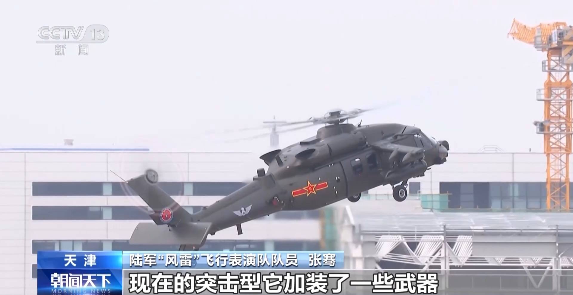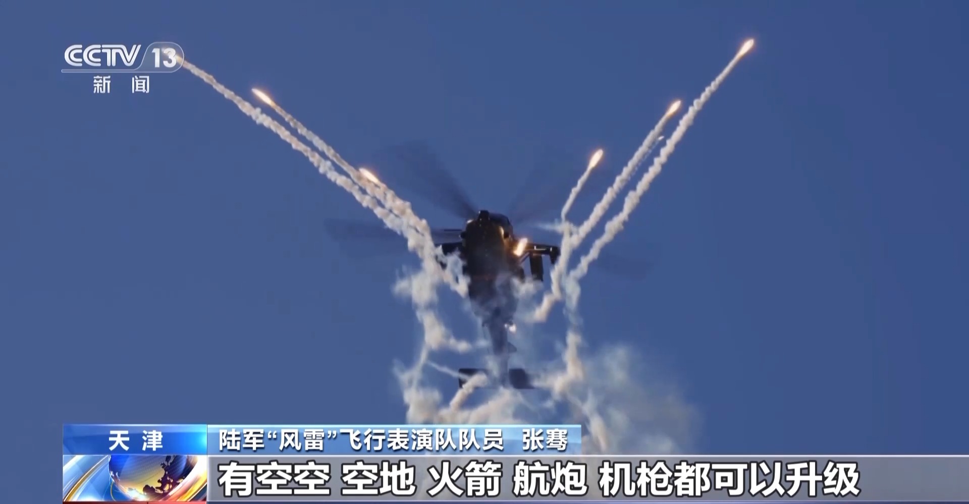 陆军“风雷”飞行表演队队员张骞:可以挂载更多武器,有空空、空地、火箭、航炮、机枪都可以升级,而且它挂载副油箱之后,作战半径也增加了。