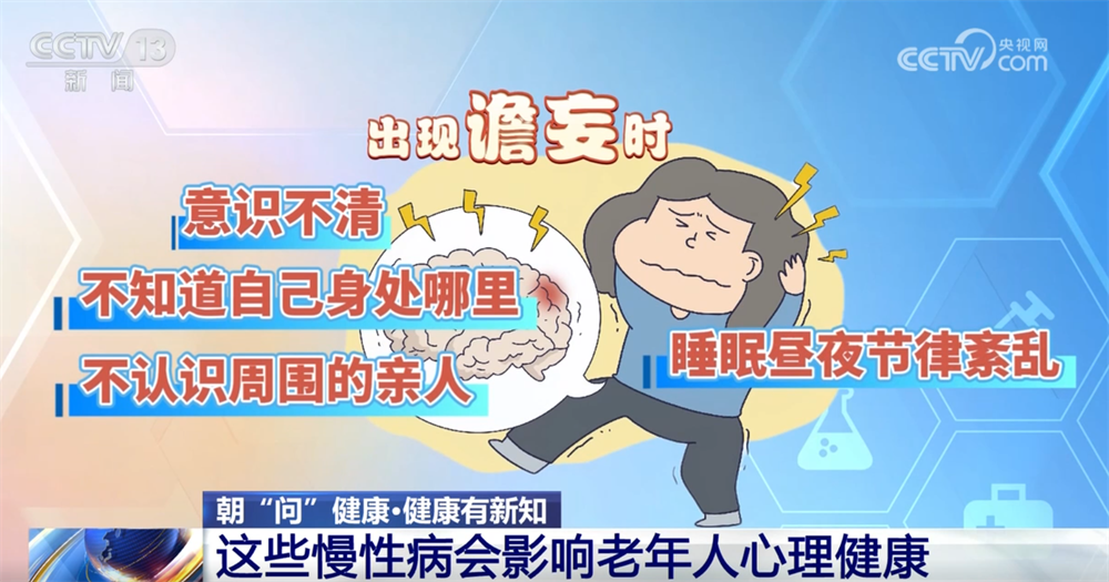 心脑血管疾病中,注意冠心病、高血压和脑梗死。部分老年脑梗死患者,当出现谵妄时会表现为意识不清,不知道自己身处哪里,不认识周围的亲人,睡眠昼夜节律紊乱,可能伴有幻觉或妄想,说些没头没尾的胡话。