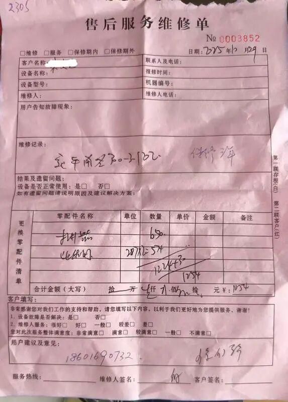 付款后,陈老伯坚持开发票,对方才不情不愿地拿出一张单据,手写了金额和“保修三年”的字样,留下一个手机号,既没有维修公司的名称、地址,也没有任何盖章。