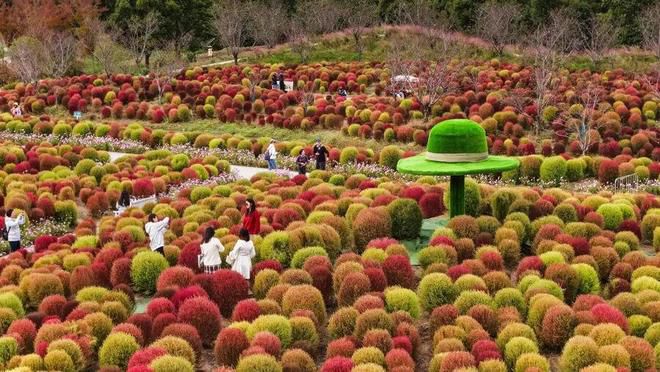 “目前,地肤草已进入年度最佳观赏期。”花开海上生态园执行总经理助理杨梅介绍,“红色覆盖率过半,景观色彩层次最为丰富。每一株地肤都圆润饱满,远观气势恢宏,近看灵动可爱,非常适合游客拍照打卡和摄影创作。”