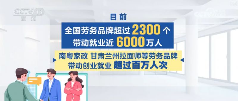 目前,全国劳务品牌超过2300个,带动就业近6000万人。南粤家政、甘肃兰州拉面师等劳务品牌带动创业就业超过百万人次。