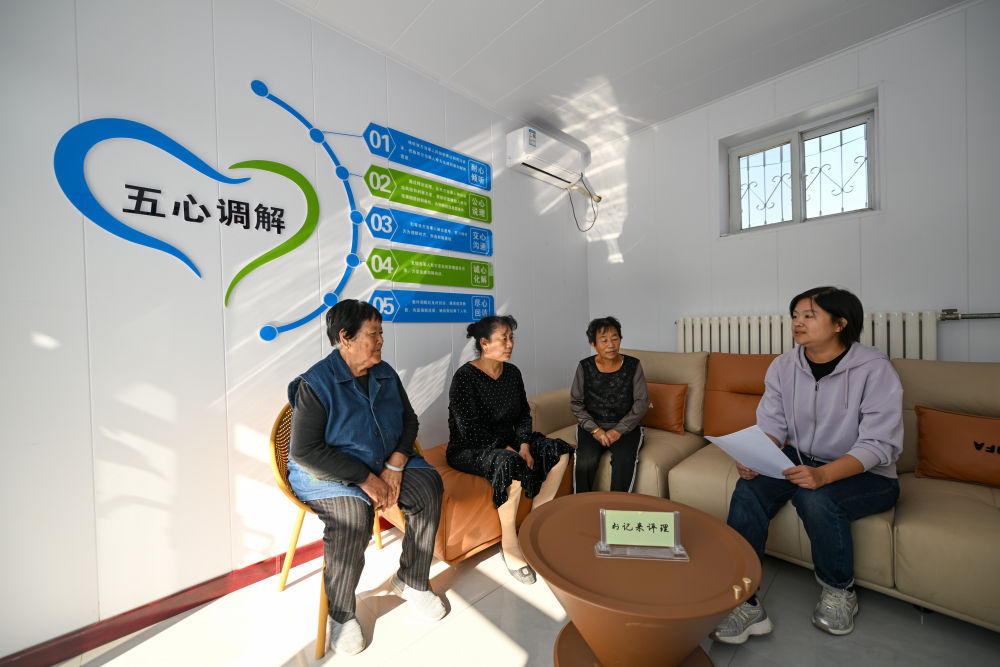 在天津市宁河区芦台街道金华路社区,社区党总支副书记吴蕊(右一)就社区监控设备安装问题为社区居民进行解答(2024年10月11日摄)。金华路社区积极践行新时代“枫桥经验”,将原社区居委会闲置用地提升改造成为联络群众的基层综合治理阵地——“解铃小院”。新华社记者孙凡越 摄
