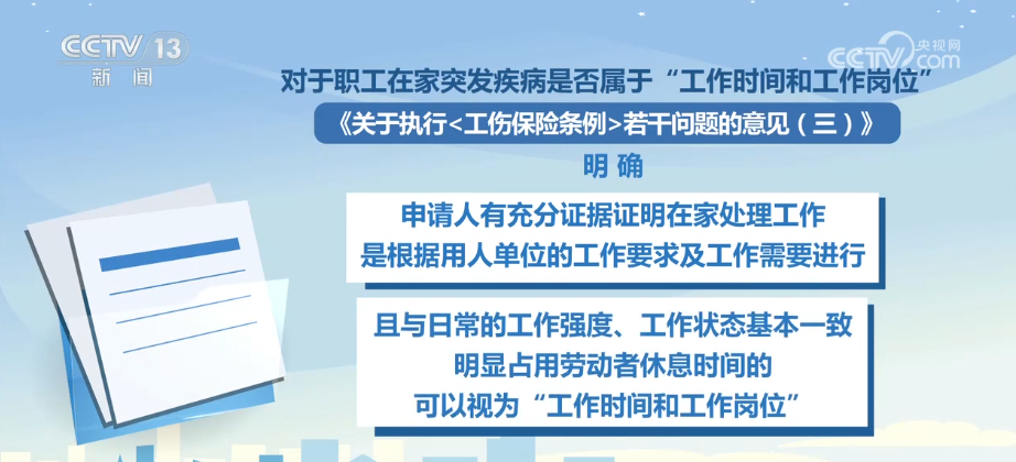 对于职工在家突发疾病是否属于“工作时间和工作岗位”,《意见(三)》明确,申请人有充分证据证明在家处理工作是根据用人单位的工作要求及工作需要进行,且与日常的工作强度、工作状态基本一致,明显占用劳动者休息时间的,可以视为“工作时间和工作岗位”。