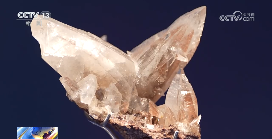 苗雨雁:目前在世界上已经发现的蝴蝶双晶,也就是在巴西和中国有产出。巴西产出的双晶,一个是颜色是白色,而且比较小,大概不会超过5厘米。但是在我们国家湖南产出的双晶,虽然我们看到一簇一簇的不太大,但是晶体比较大,有的能达到10厘米,这个是比较罕见的。另一个我们看它的颜色,也是有柔和的粉红色,粉红得像幻影一样。