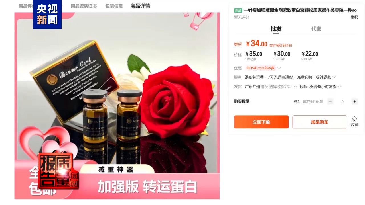 不用节食,也不用运动,只需要打一针就能轻松变瘦,这样的“减肥神话”您是否也曾心动?最近在多个社交平台和网购平台,名为“转运蛋白”“暴瘦王”的减肥产品,被包装成网红爆款,吸引了大量消费者。然而,有消费者反映,使用了这样的减肥产品,却险些丧命。到底发生了什么呢?