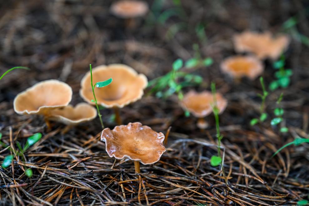 这是在内蒙古通辽市科尔沁左翼后旗的科尔沁沙地“双百万亩”综合治理工程努古斯台项目区内,樟子松林下生长的蘑菇(2024年8月3日摄)。新华社记者连振 摄
