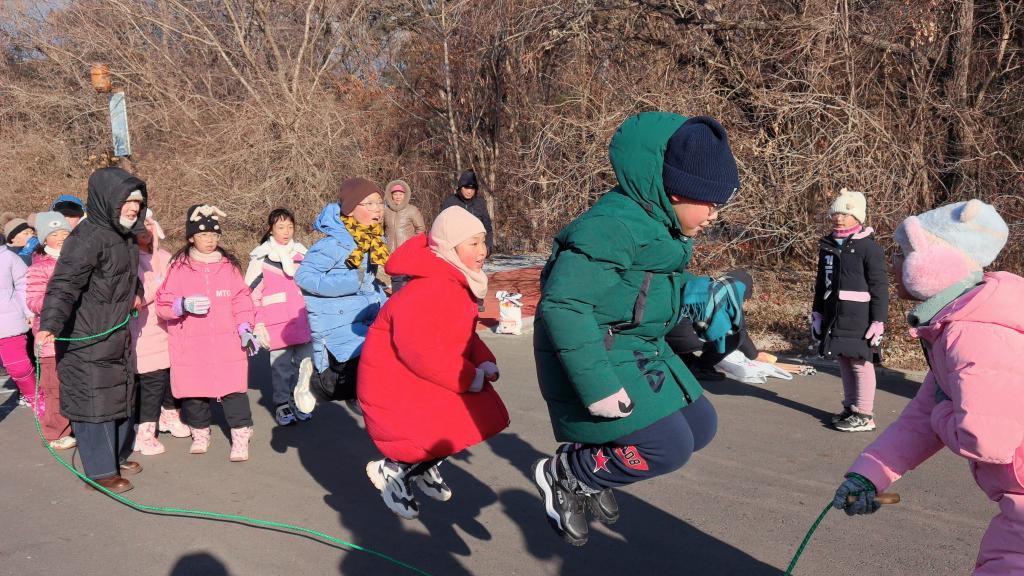 12月3日,吉林省第二实验学校的学生在南湖公园开展“亲近自然银冬初体验”主题活动,图为学生们在跳大绳。新华社记者 李典摄
