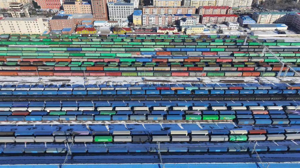 在满洲里铁路口岸停放整齐的中欧班列。(中国铁路哈尔滨局集团有限公司供图)