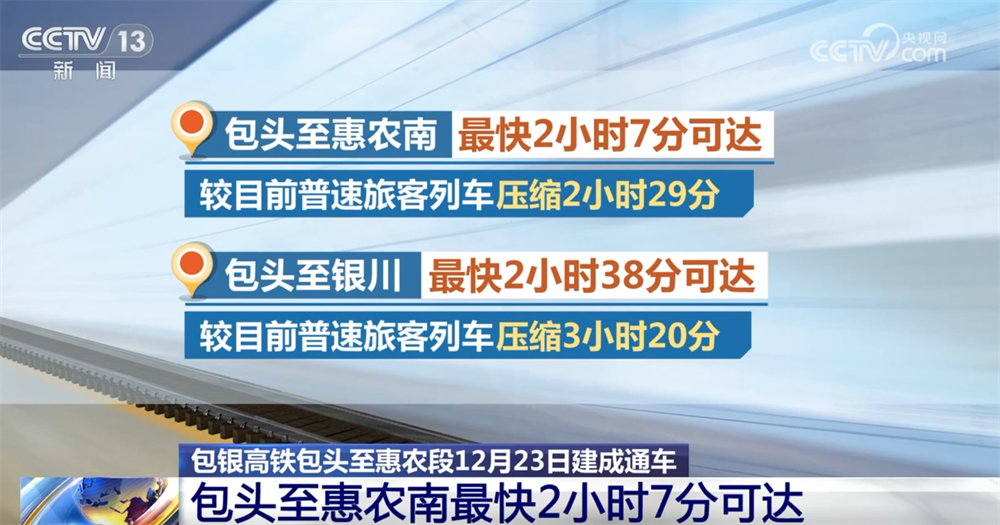 从国铁集团获悉,包头至银川高铁包头至惠农段将于12月23日建成通车,包头至银川高铁实现全线贯通运营。