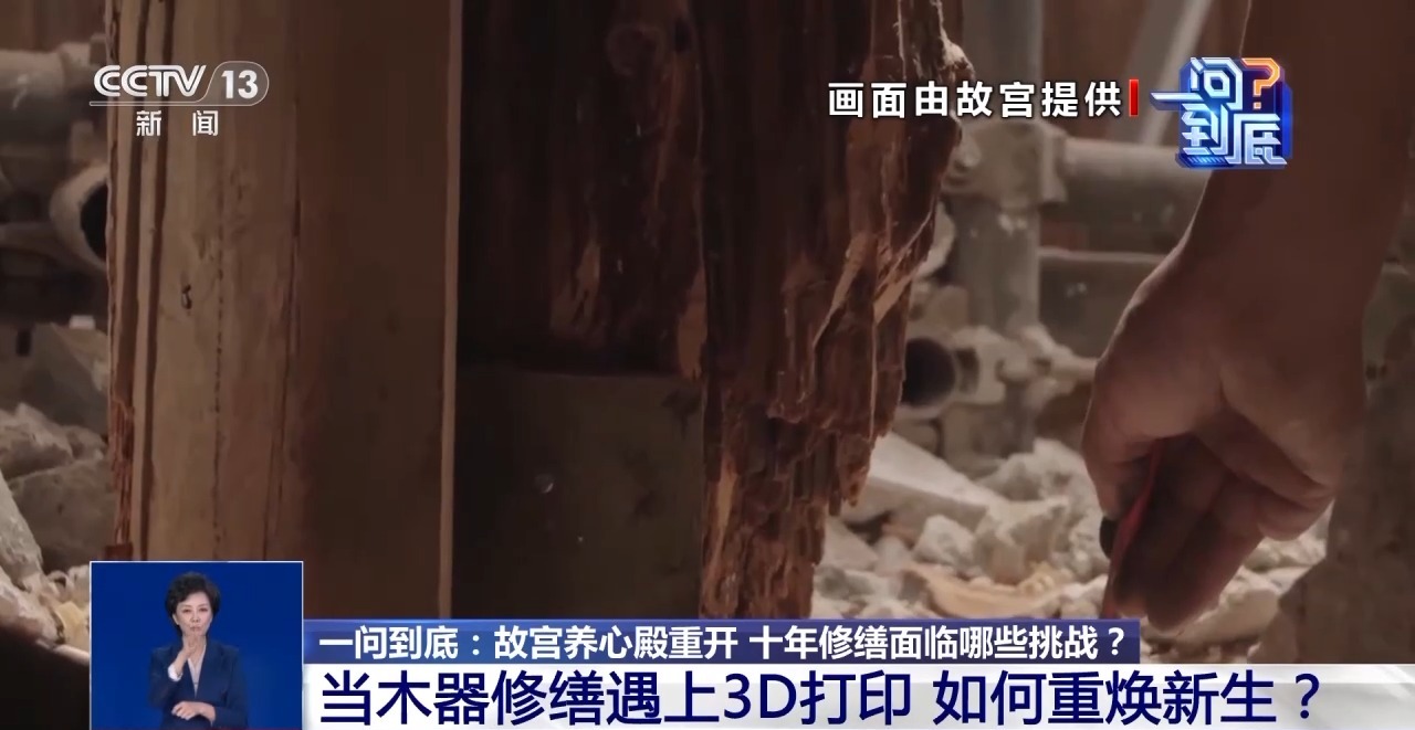 故宫博物院文保修复部主任屈峰:按照传统的方式,要给它补配一个缺失的地方很麻烦。今天是用3D的模型先建出来、打印出来,拿过来放上去比对,合适了以后,回去参考3D的模型,再手工做一个木头装上去,极大提高了工作效率。