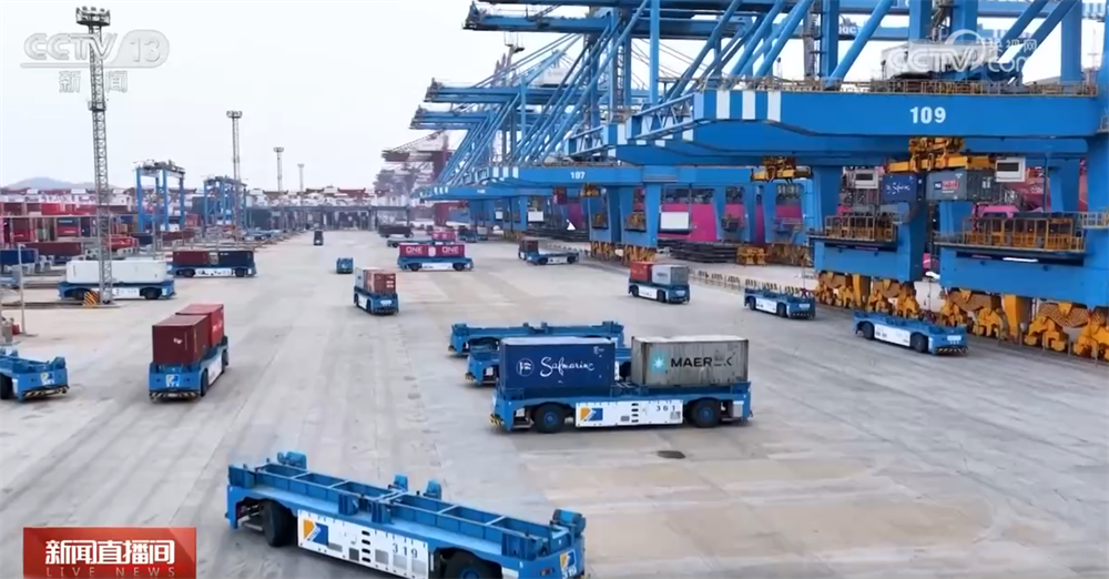 在青岛港自动化码头上,自动化桥吊、高速轨道吊、无人驾驶的AGV(自动引导车)有条不紊、高效运转,青岛港已经十三次刷新全球自动化集装箱码头装卸效率世界纪录。