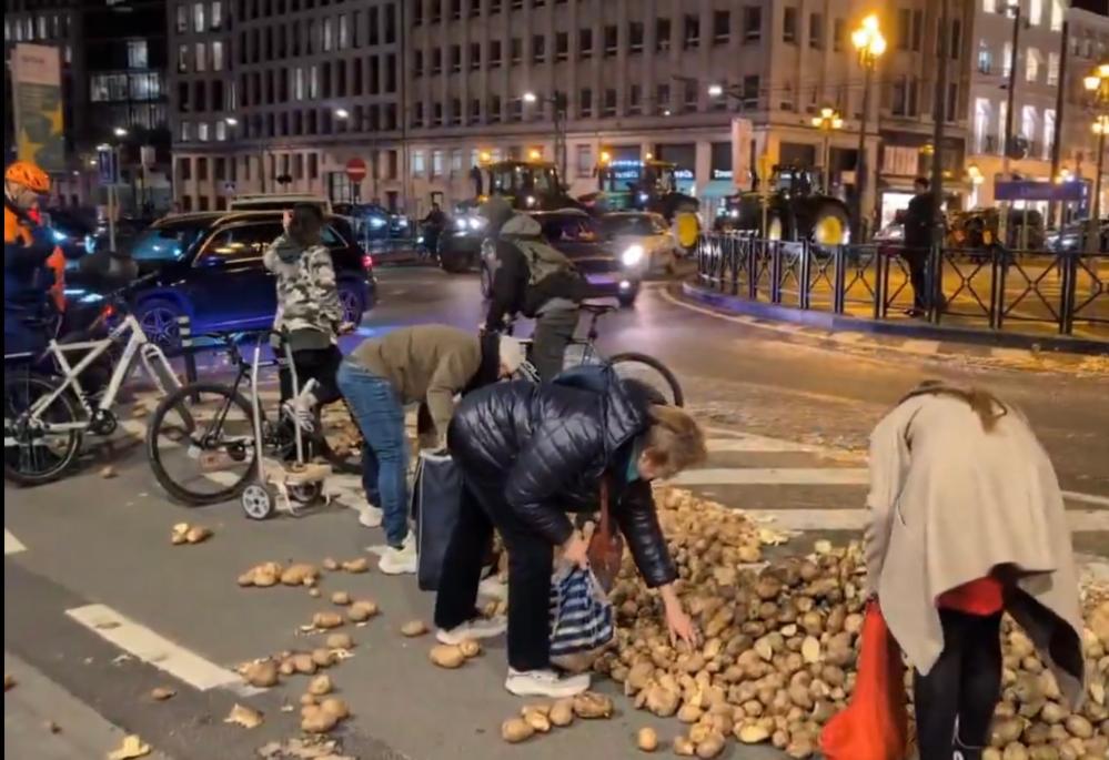 2025年12月18日,在比利时布鲁塞尔,一些市民捡拾示威者遗弃的土豆(视频截图)。新华社发