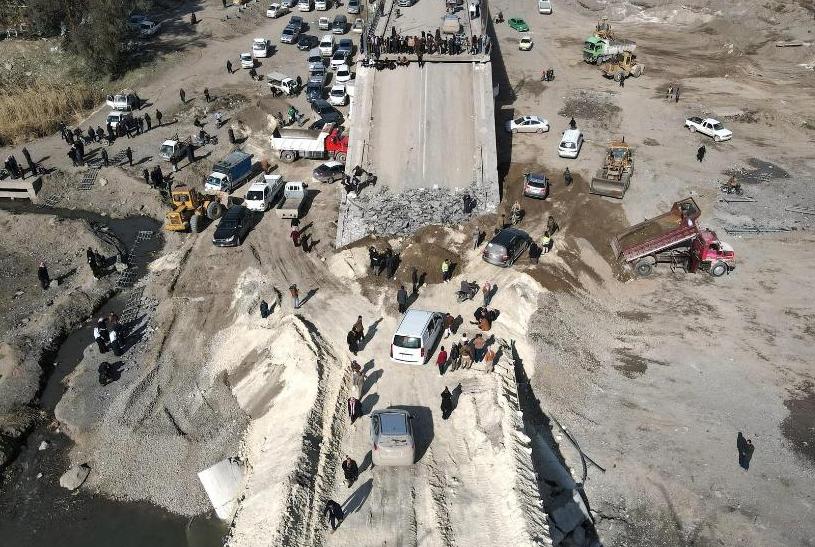 这是1月21日在叙利亚东部拉卡省航拍的在冲突中被炸毁的拉希德大桥。新华社发