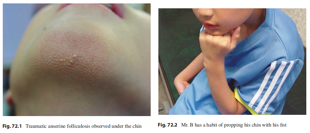 图注:(a) 颌部簇集的毛囊性丘疹;(b) 患儿在观看平板电脑时,将下巴托在手掌上。