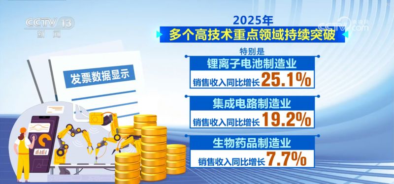 发票数据显示,2025年多个高技术重点领域持续突破,特别是锂离子电池制造、集成电路制造、生物药品制造等行业表现亮眼,销售收入分别同比增长25.1%、19.2%和7.7%。