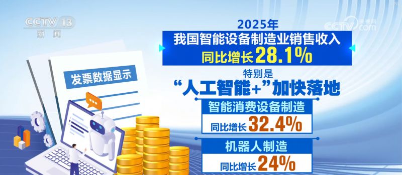 发票数据显示,2025年,我国智能设备制造业销售收入同比增长28.1%,特别是“人工智能 ”加快落地,智能消费设备制造、机器人制造同比分别增长32.4%和24%。