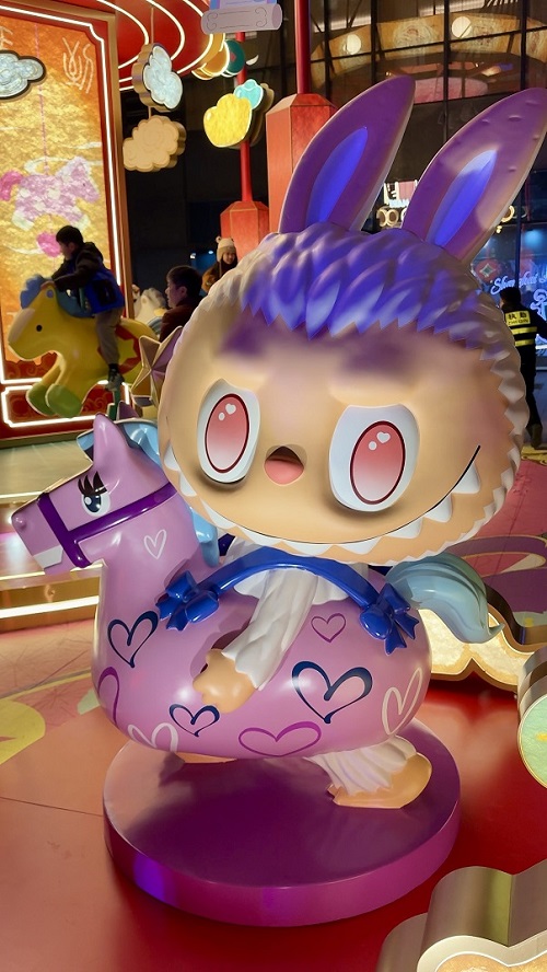 宫灯旋转木马与泡泡玛特IP灯组打造潮流与传统融合的惊喜体验;南区MOLLY灯组热情迎客,Hirono小野、BABYMOLLY等IP灯组铺就新春祈福之路。