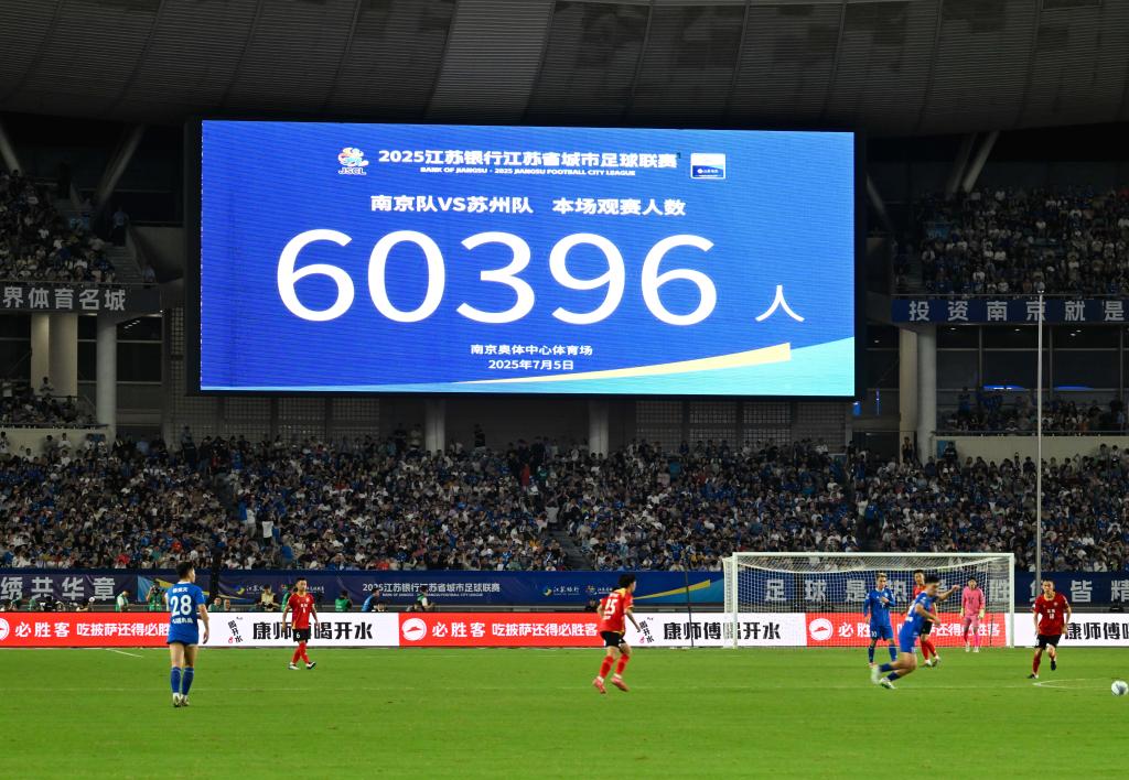 2025年7月5日,球场大屏显示本场比赛共有60396名观众到场观赛,打破江苏省城市足球联赛单场上座纪录。当日,在江苏南京举行的2025江苏省城市足球联赛第六轮比赛中,南京队主场0比0战平苏州队。新华社记者季春鹏 摄
