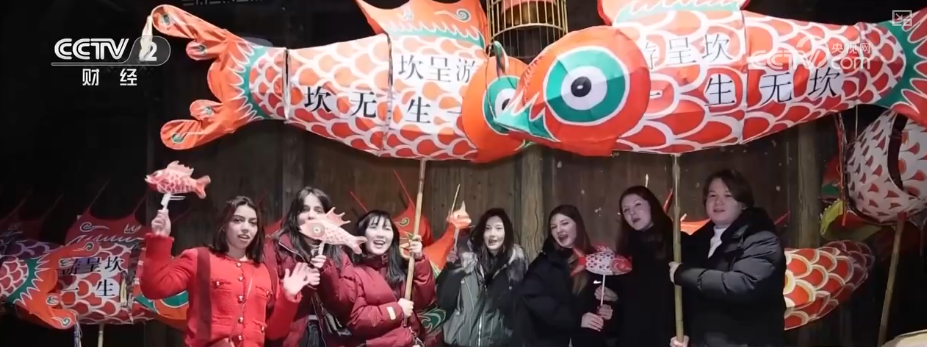 除了在“世界超市”尽情购物,外国游客也会把体验中国的非遗文化纳入春节的行程当中。在安徽黄山,他们可以手持鱼灯,参与到鱼灯巡游的队伍。或是在老师的指导下,亲手绘制鳞片,制作一个属于自己的鱼灯。