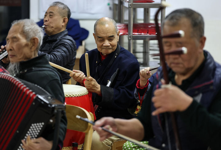 2月10日,养老院的老人在联欢会上演奏歌曲。