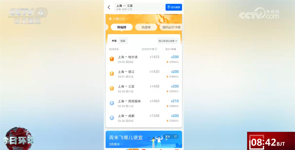 去哪儿大数据研究院研究员 石珂:热门航线平均票价普遍回落10%—50%。