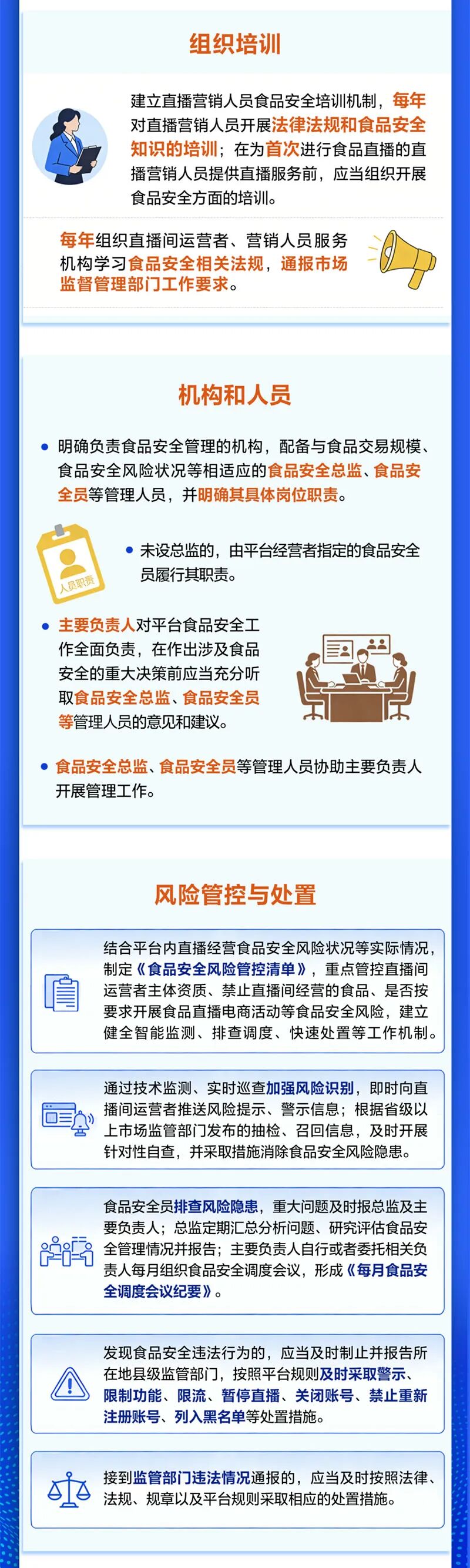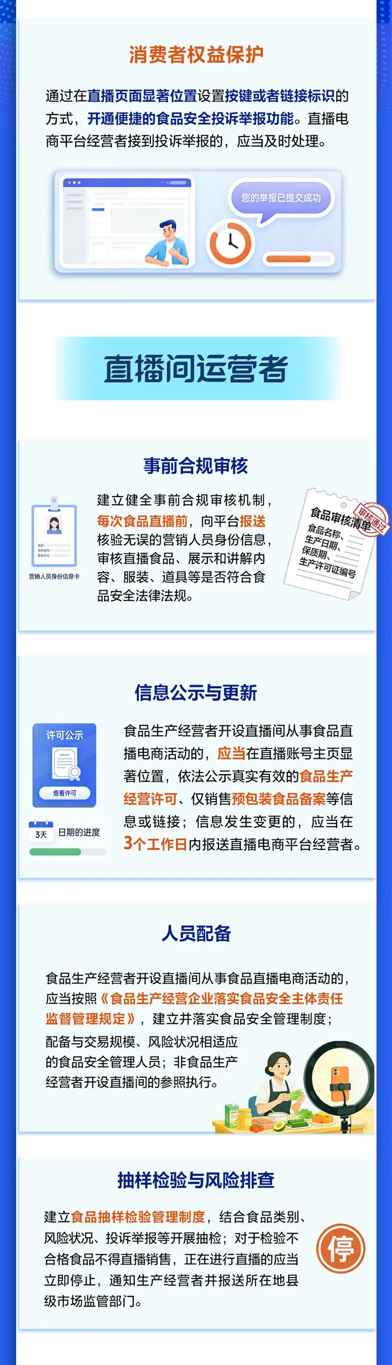 《规定》要求,平台必须结合食品类别、交易规模和风险状况,制定《食品安全风险管控清单》,将直播间运营者资质、禁售食品排查、直播行为规范等,作为重点管控内容;建立“智能监测、排查调度、快速处置”的工作机制,通过技术监测、实时巡查等方式,主动识别风险,即时推送风险提示。