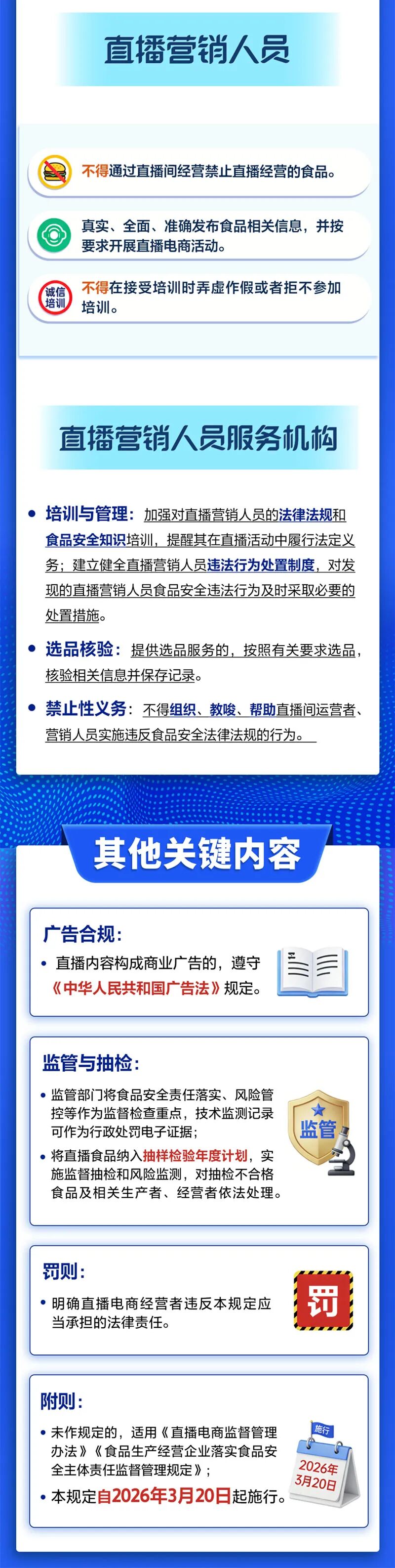 市市场监管局介绍,近日,针对食品直播领域存在的突出问题,市场监管总局发布了《直播电商经营者落实食品安全主体责任监督管理规定》(以下简称《规定》),《规定》为直播电商食品“划红线立规矩”,将于2026年3月20日起正式施行!