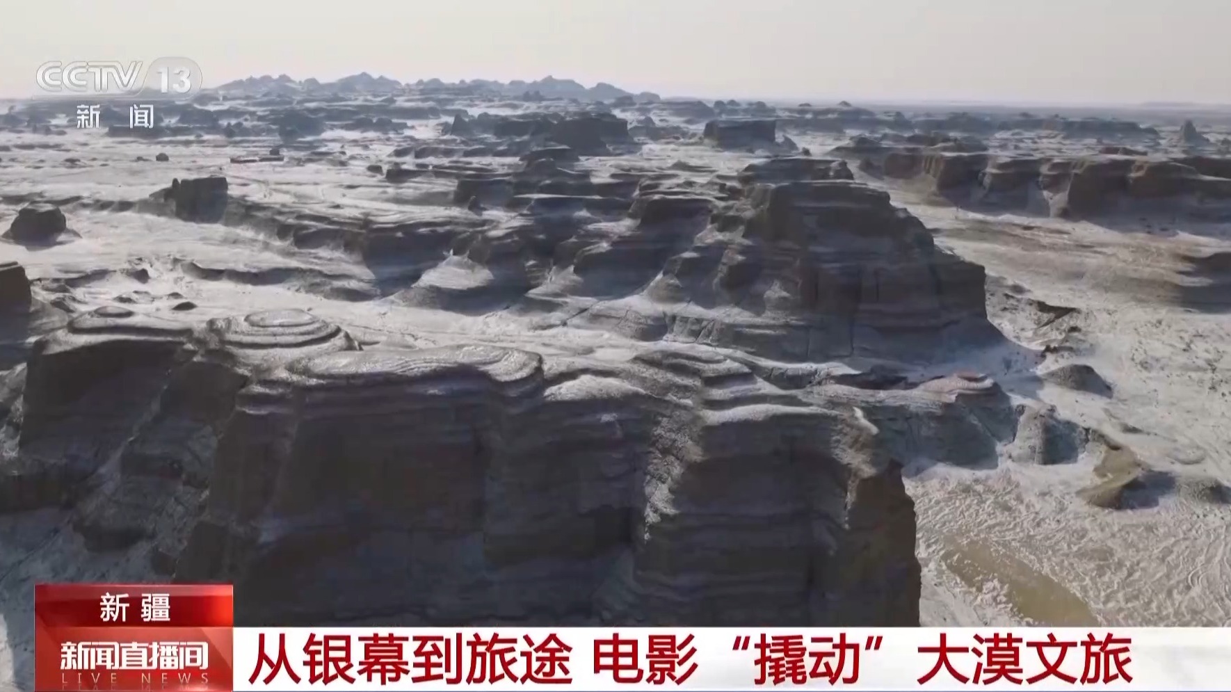 总台记者薛冰:这里就是位于新疆克拉玛依的世界魔鬼城。此刻我手中这张电影票根,成为我驰骋这片江湖的“通关文牒”。有了它,就可以在这个“天然摄影棚”中一秒“入戏”。