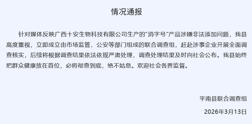 据“今日平南”公众号消息,广西平南县联合调查组发布情况通报:针对媒体反映广西十安生物科技有限公司生产的“消字号”产品涉嫌非法添加问题,我县高度重视,立即成立由市场监管、公安等部门组成的联合调查组,赶赴涉事企业开展全面调查核实,后续将根据调查结果依法依规严肃处理,调查处理结果及时向社会公布。我县始终把群众健康放在首位,必将彻查到底,绝不姑息。欢迎社会各界监督。