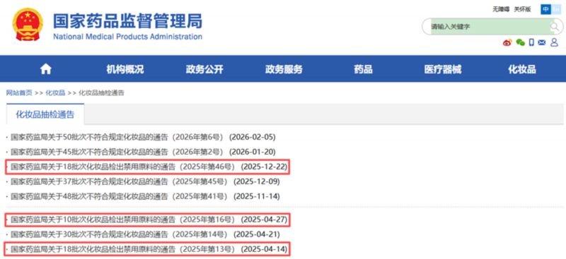 截图来自国家药品监督管理局网站化妆品检出禁用原料通告