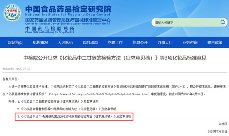 面对儿童护肤品市场乱象,监管层面已开始补齐短板。中国食品药品检定研究院制定《化妆品中129种原料检验方法(征求意见稿)》将禁用激素清单从原63种扩充至129种,其中包含氯倍他索丁酸酯及其检测方法。
