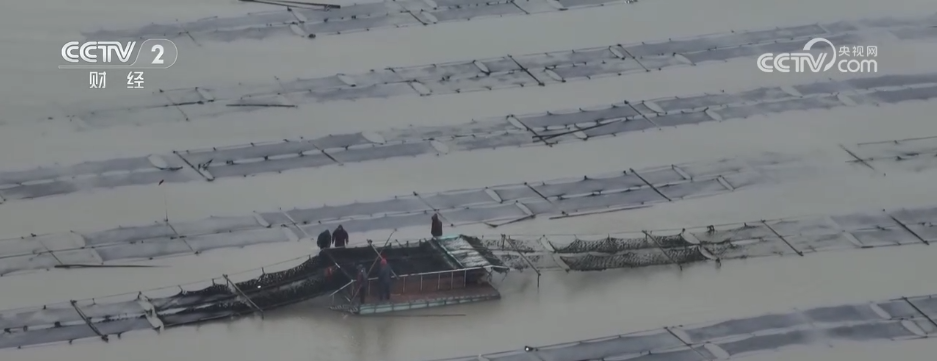 通过航拍画面可以看到,由竹杆搭建的紫菜筏架整齐排列在海面上,紫菜附着在筏架网绳上,伴随着潮水的节律一起舞动。村民们驾驶采收船穿梭其中,新鲜的紫菜被源源不断地采进货仓。据了解,这片海上紫菜养殖面积达4000多亩。每年的9月紫菜苗投放到大海里,经过3个月左右生长便进入采摘期。立春以后收割的紫菜,被称为“春菜”,因其口感鲜嫩、营养丰富备受市场青睐。最近正是当地条斑紫菜采收高峰期,每天的采收量能够在18到20吨左右。