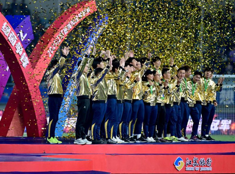 2025年11月1日,“苏超”冠军泰州队在颁奖仪式上庆祝。新华社发(曹政 摄)